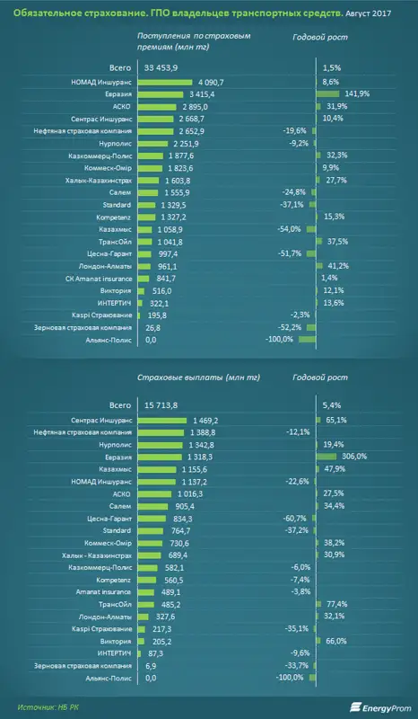 За январь-август страховые компании собрали премии в сегменте обязательного страхования гражданско-правовой ответственности автовладельцев в размере 33,5 млрд тг - это на 1,5% больше, чем в аналогичном периоде годом ранее. Лидируют объемами собранных премий "Номад Иншуранс" - 4,1 млрд тг, +8,6% за год, "Евразия" - 3,4 млрд тг, годовой рост - сразу в 2,4 раза, и "Аско" - 2,9 млрд тг, +31,9% за год.