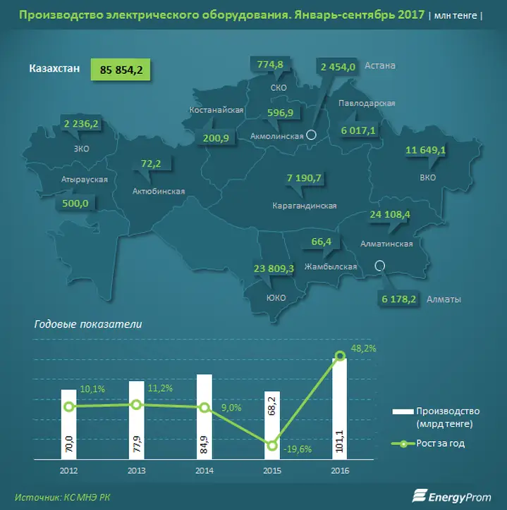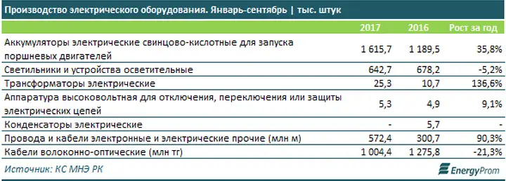 По итогам трех кварталов, производство электрического оборудования в РК выросло на 37,2% год-к-году, до 85,9 млрд тг. С учетом инфляции (в сопоставимых ценах) годовой рост составил 32,1%.