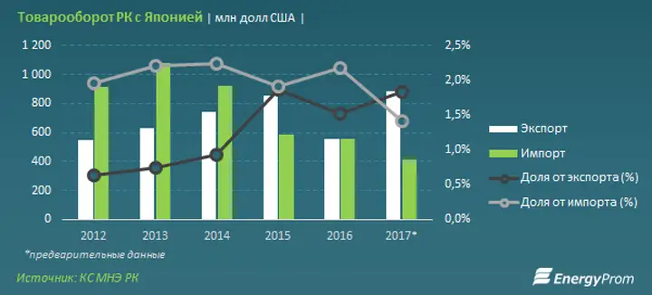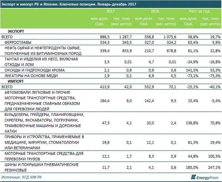 Среди ключевых экспортных позиций РК на японский рынок в 2017 году - ферросплавы (на 534,3 млн долл), и нефть и нефтепродукты сырые (на 339,4 млн долл). На эти 2 позиции пришлось 98,6% всего экспорта в Страну восходящего солнца.