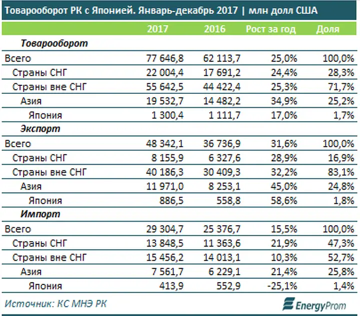 Примечательно, что рост обеспечен усилением экспортного направления - так, поставки на рынок Японии выросли за год сразу на 58,6%, это 1,8% от всего экспорта РК, против 1,5% годом ранее.