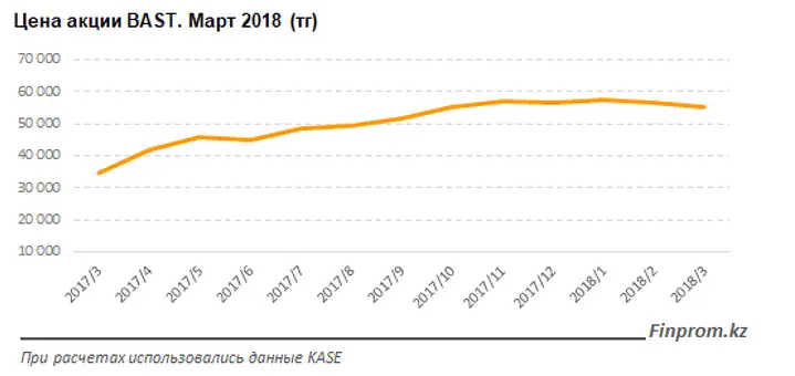 За год (март 2017-2018) цены акций компании BAST выросли на 58,5% - c 34844,99 тг до 55247,82 тг.