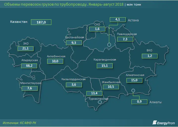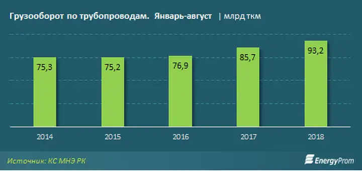 Объемы транспортировок по трубопроводам РК растут второй год подряд, и составили за январь-август 2018 года 187 млн тонн, что на 21,8% больше, чем за аналогичный период прошлого года.