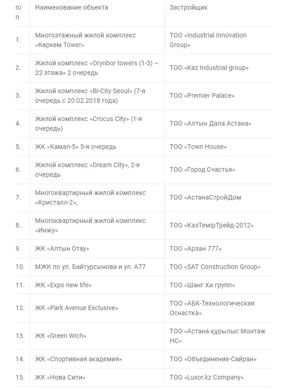 По итогам выявленных нарушений на сегодняшний день привлечено к административной ответственности, согласно КоАП РК, 15 строительных компаний: