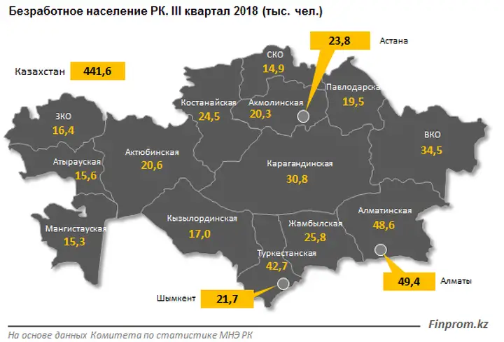 Наибольшая численность безработных зафиксирована в Алматы — 11,2% от РК; наименьшая — в Северо-Казахстанской области, всего 3,4% от РК