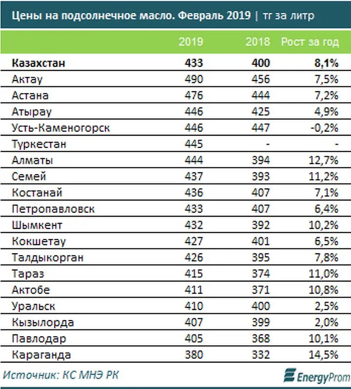 К марту текущего года цены на подсолнечное масло в магазинах и на базарах Казахстана выросли на 8,1% за год, до 432,8 тг за литр.