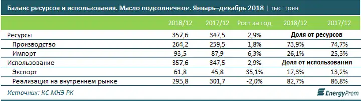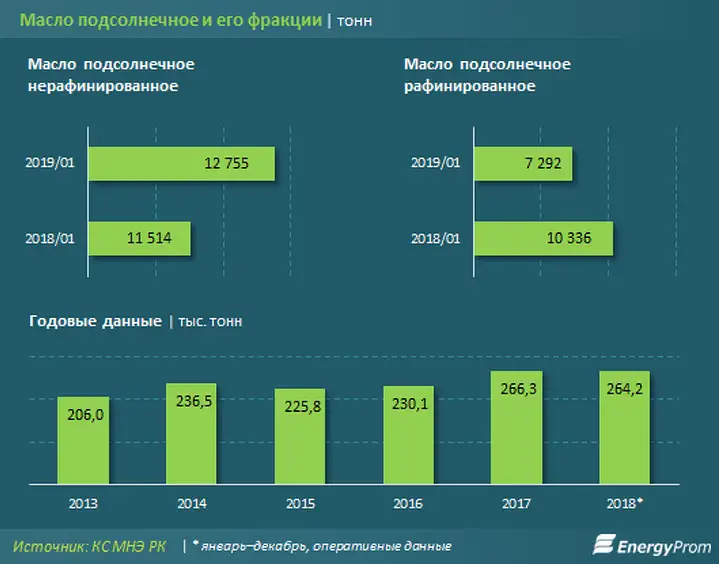 Основная доля производства подсолнечного масла приходится на ВКО: 82,4% от всего нерафинированного по РК (10,5 тыс. тонн, +11,8% за год) и 71,5% — от рафинированного (5,2 тыс. тонн, −21,7% за год)