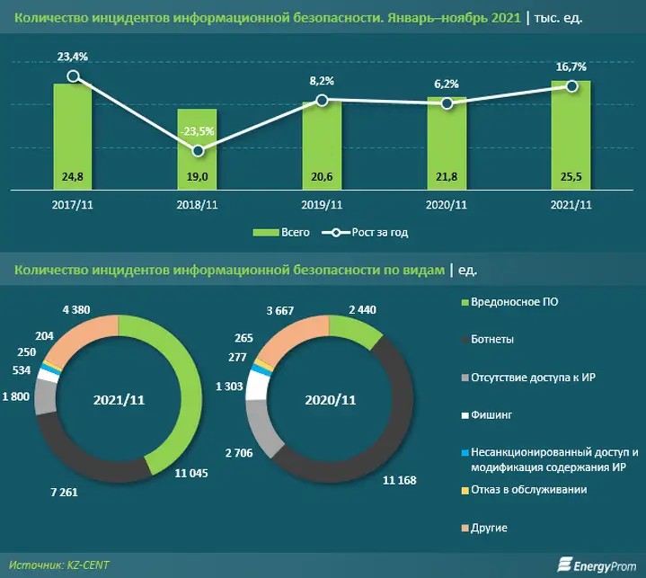 По итогам одиннадцати месяцев текущего года в Казахстане совершили 25,5 тыс. кибератак — на 16,7% больше, чем годом ранее. Для сравнения: в аналогичном периоде 2020-го количество кибератак показало рост на 6,2%, до 21,8 тыс. случаев.