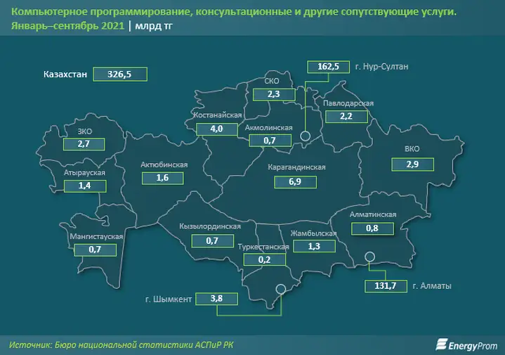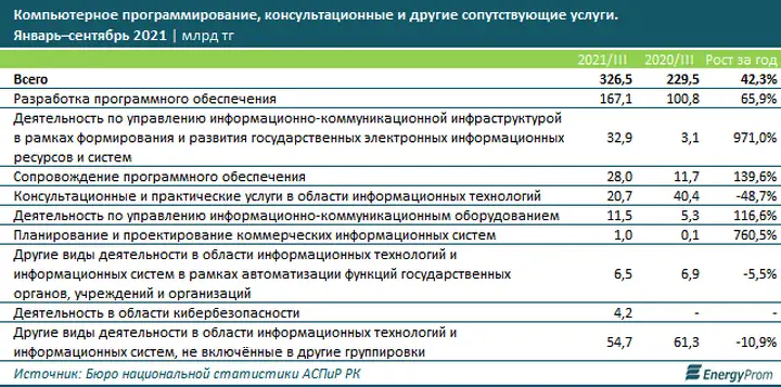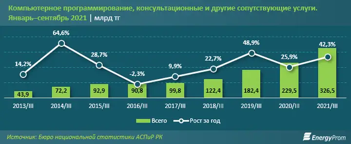 За январь–сентябрь 2021 года объём услуг в сфере компьютерного программирования, консультационных и других сопутствующих сервисов достиг 326,5 млрд тг — на 42,3% больше в стоимостном выражении, чем годом ранее. Реальный рост в секторе составил 35,3%, передает energyprom.kz.