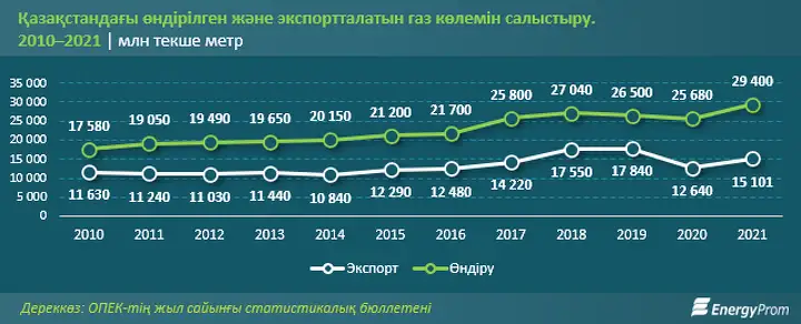 Халықтың жартысына жуығы бұл ресурсқа қол жеткізе алмағанына қарамастан, Қазақстан өндірілген газдың жартысынан азын ғана тұтынады, ал ел ішінде газды тасымалдауға арналған газбен қамтудың ішкі кең желілерінің жоқтығынан оның көп бөлігін экспортқа шығарады. 2010–2021 жылдар аралығында Қазақстан жылдық газ өндірудің орта есеппен 58%-ын экспорттаған.