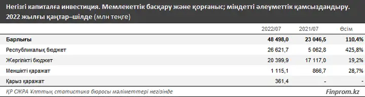 Қазақстанда биылғы жылдың қаңтар-шілде айларында мемлекеттік басқару және қорғаныс, сондай-ақ міндетті әлеуметтік қамсыздандыру саласындағы негізгі капиталға салынған инвестиция 48,5 млрд теңгеге жетті, бұл бір жыл бұрынғыдан құндық мәнде 2,1 есе, нақты физикалық көлемде екі есе көп (IFO — 199,2%).