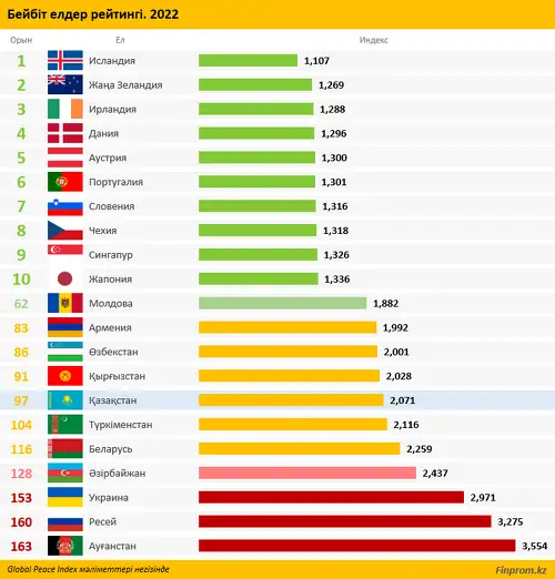 2022 жылғы бейбітшілікті сүйетін елдер рейтингінде Қазақстан әлемдегі 163 елдің ішінде 97-орында. ҚР индексі 2,071. Өткен жылмен салыстырғанда ел бірден 29 орын төмендеді, передает finprom.kz.