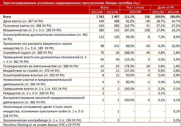 За январь–сентябрь 2022 года в стране зарегистрировали 1,6 тыс. уголовных коррупционных преступлений — на 11,1% больше, чем годом ранее, передает ranking.kz.