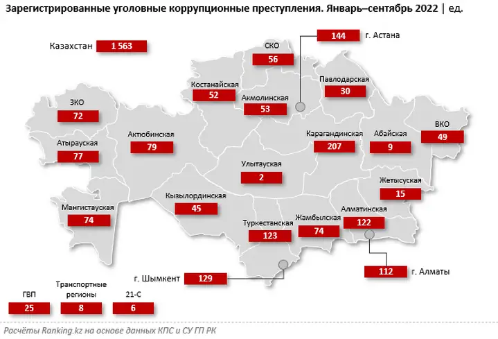 В региональном разрезе больше всего коррупционных правонарушений зарегистрировали в Карагандинской области: 207 случаев, годовой рост — в 3 раза. В тройку антилидеров также попали столица (144 случая, плюс 2,9%) и Шымкент (129 случаев, плюс 25,2%). Меньше всего правонарушений в секторе было зарегистрировано в новообразованных областях — Улытауской (2 случая), Абайской (9 случаев) и Жетысуской (15 случаев), — что объясняется особенностями статистики для новых регионов.