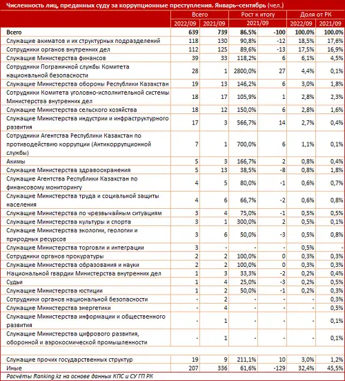 Среди служащих государственных органов коррупционные преступления чаще всего совершали служащие акиматов и их структурных подразделений: 118 человек, минус 9,2% за год. Далее идут сотрудники органов внутренних дел (112 человек) и служащие Министерства финансов (39 человек). Также на коррупции с начала года попались 5 акимов, 1 судья, 7 сотрудников Агентства по противодействию коррупции, 2 сотрудника органов прокуратуры.
