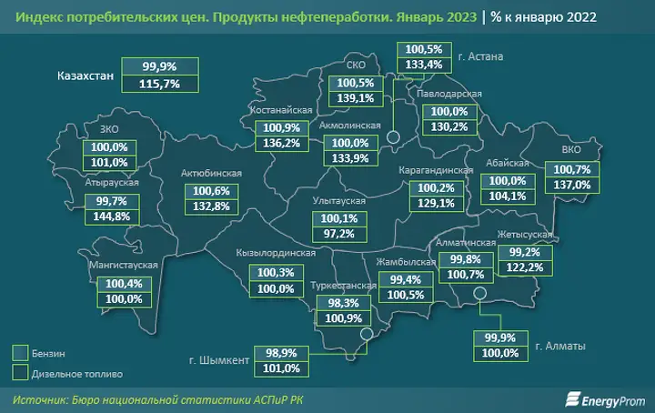 Сильнее всего рост цен на дизельное топливо ударил по кошелькам жителей Атырауской области: здесь удорожание составило сразу 44,8% за год. Заметно выросли также цены в Северо-Казахстанской (плюс 39,1%) и Восточно-Казахстанской (плюс 37%) областях. В Мангистауской и Кызылординской областях, а также в Алматы цены остались на уровне прошлого года. В Улытауской области дизтопливо подешевело на 2,8%.