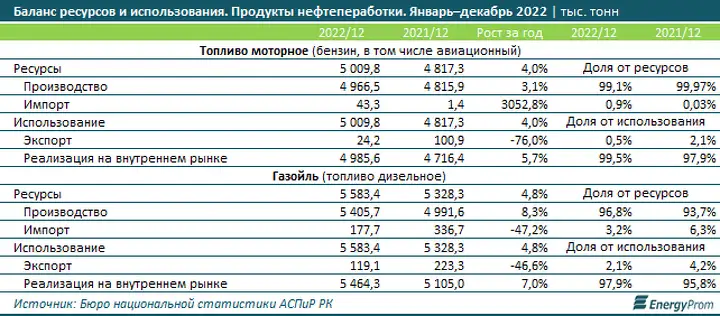 По итогам января–декабря 2022 года местные компании обеспечили бензином местный рынок (реализацию на внутреннем рынке плюс экспорт) практически полностью: на 99,1%, против 99,97% годом ранее.