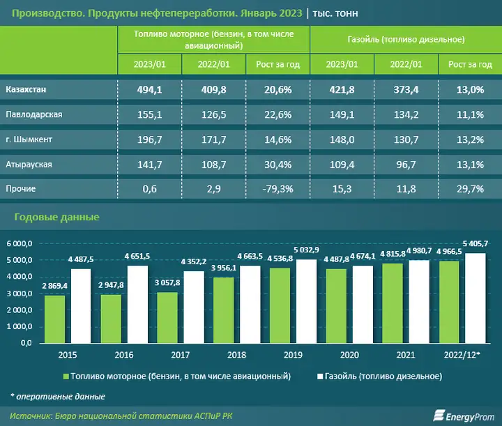 В целом за январь–декабрь 2022 года в стране произвели 5 млн тонн бензина и 5,4 млн тонн дизтоплива. Рост производства составил 3,1% и 8,3% соответственно.
