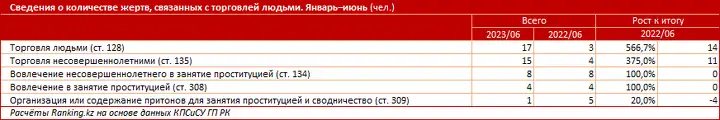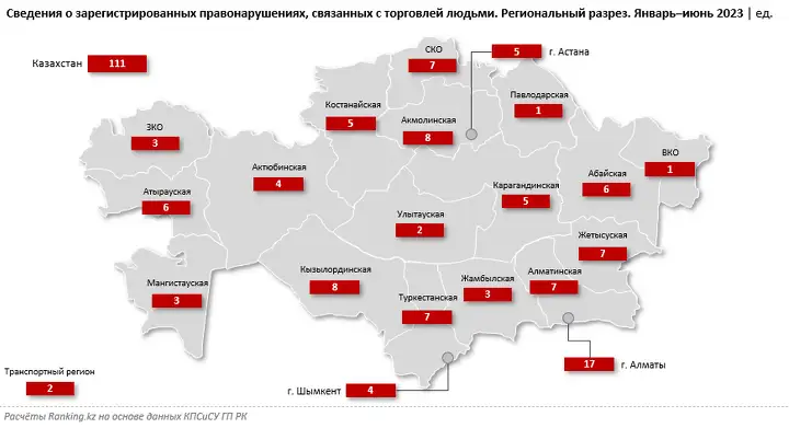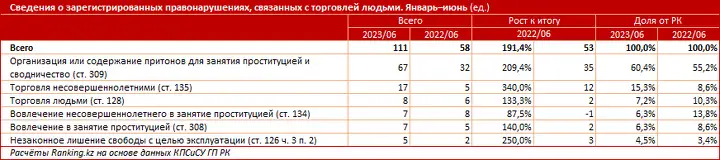 о итогам первого полугодия 2023 года в стране было зарегистрировано 111 уголовных правонарушений, связанных с торговлей людьми. Это почти вдвое больше (на 91,4%) по сравнению с аналогичным периодом прошлого года, передает ranking.kz.